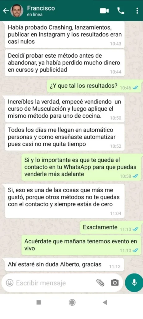 Ahora les dejo la conversación WhatsApp que nos pasó nuestro alumno para que veas el potencial.
